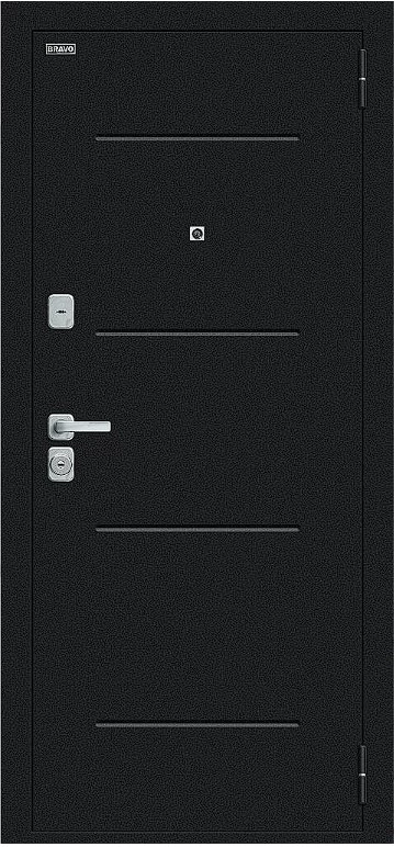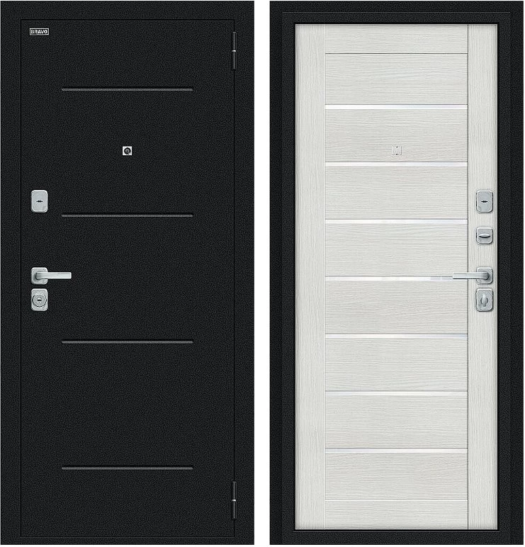 Надежная входная Дверь Браво Техно/BChrome Букле черное/Bianco Melinga премиум класса по цене 34 543 руб. Большая толщина стали защитит от проникновения в ваш дом, квартиру или коттедж. Используется очень качественная фурнитура: замки, цилиндры, ручки, защелки. Покрытие и отделка двери изготовлено под внимательным контролем производителя. Дверь имеет долгий срок службы и гарантию.